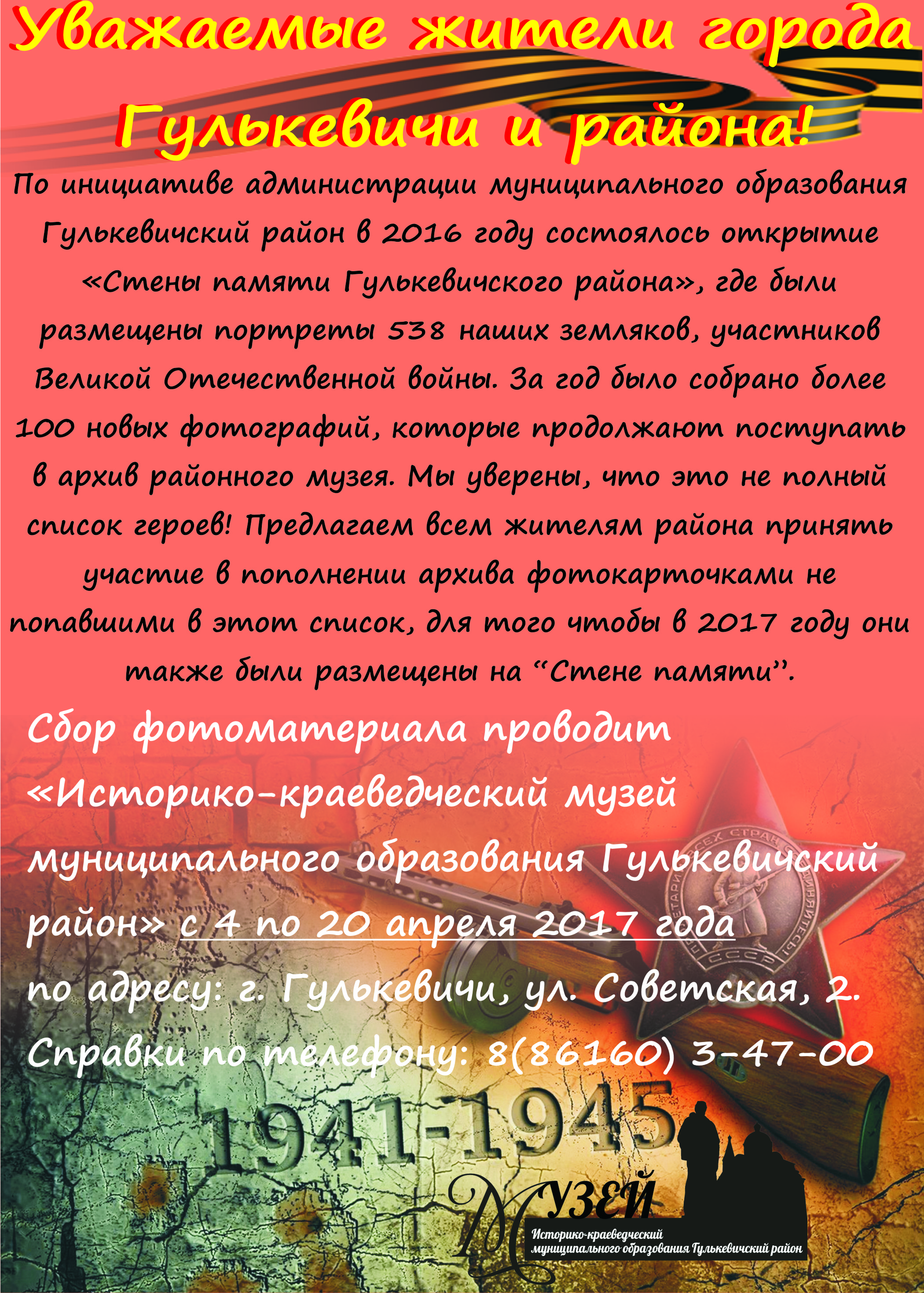 Внимание всех жителей города Гулькевичи, Гулькевичского района и Краснодарского края! Районный музей объявляет о дополнительном сборе фотографий участни