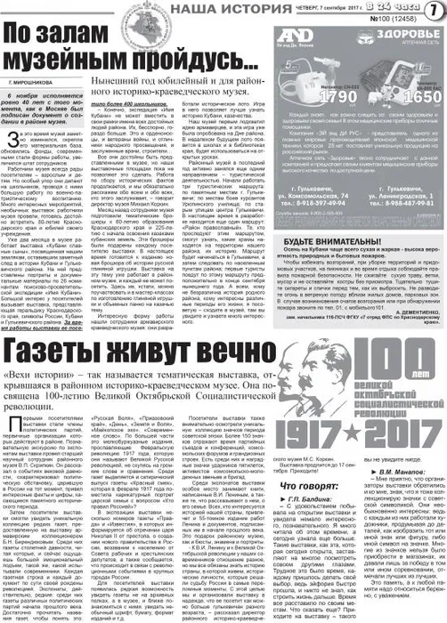 Спешим поделиться хорошей новостью! В 100-м номере гулькевичской общественно-политической газеты "В 24 часа" http://www.hour24.ru/ опубликованы два материала о работе музея - в первом случае о подготовке и работе в рамках мероприятий к 80-летию Краснодарского края, второй материал об открытии выставки "Вехи истории".
