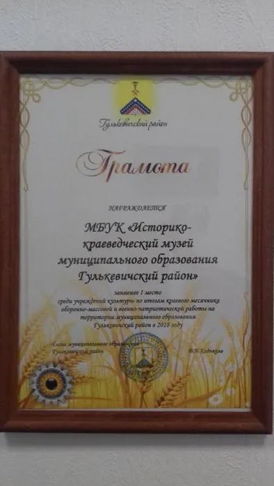 Традиционно в конце января в Краснодарском крае стартует месячник оборонно-массовой и военно-патриотической работы, в рамках которого проходит масса мероприятий, в которых принимают участие учреждения культуры, образования и других сфер. 28 февраля в культурно-досуговом центре "Лукоморье" подведели итоги большой работы патритического воспитания, где были вручены грамоты победителям. За свою работу районный историко-краеведческий музей удостоился грамоты за первое место среди учреждений культуры.