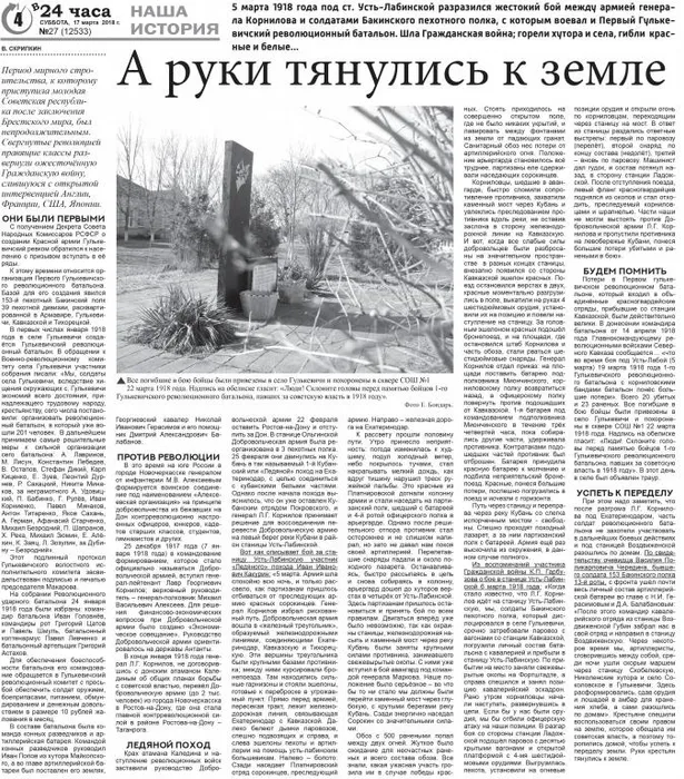 Под таким названием в одном из выпусков районной общественно-политической газеты Гулькевичи "В 24 часа" вышла статья о жестоком бое армии генерала Корнилова и солдатами Бакинского пехотного полка, с которым воевал и первый Гулькевичский революционный батальон 5 марта 1918 года под станицей Усть-Лабинской. Материал написан старшим научным сотрудником музей В.П.Скрипкиным.