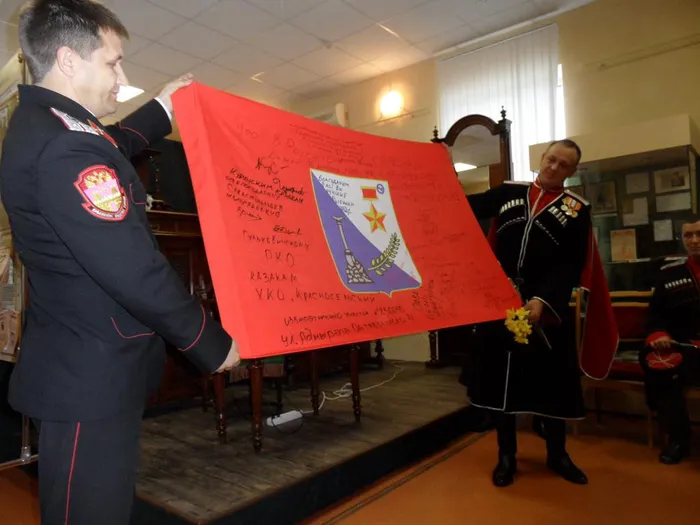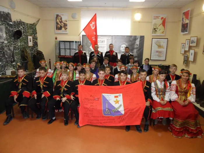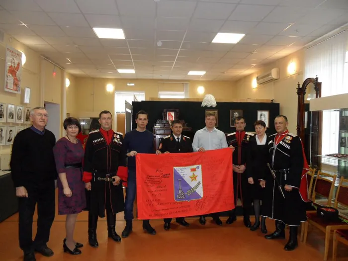 В составе делегации казаков района присутствовал атаман казачьего общества Александр Власов, передавший в дар музею флаг, привезенный из командировки, пообещавший в следующем году, еще и пополнить фонды памятной медалью «За возвращения Крыма». В свою очередь семиклассник Колбышев Федор произнес ответное слово казакам, а сводный ансамбль «Родничёк» исполнил для них народные песни.